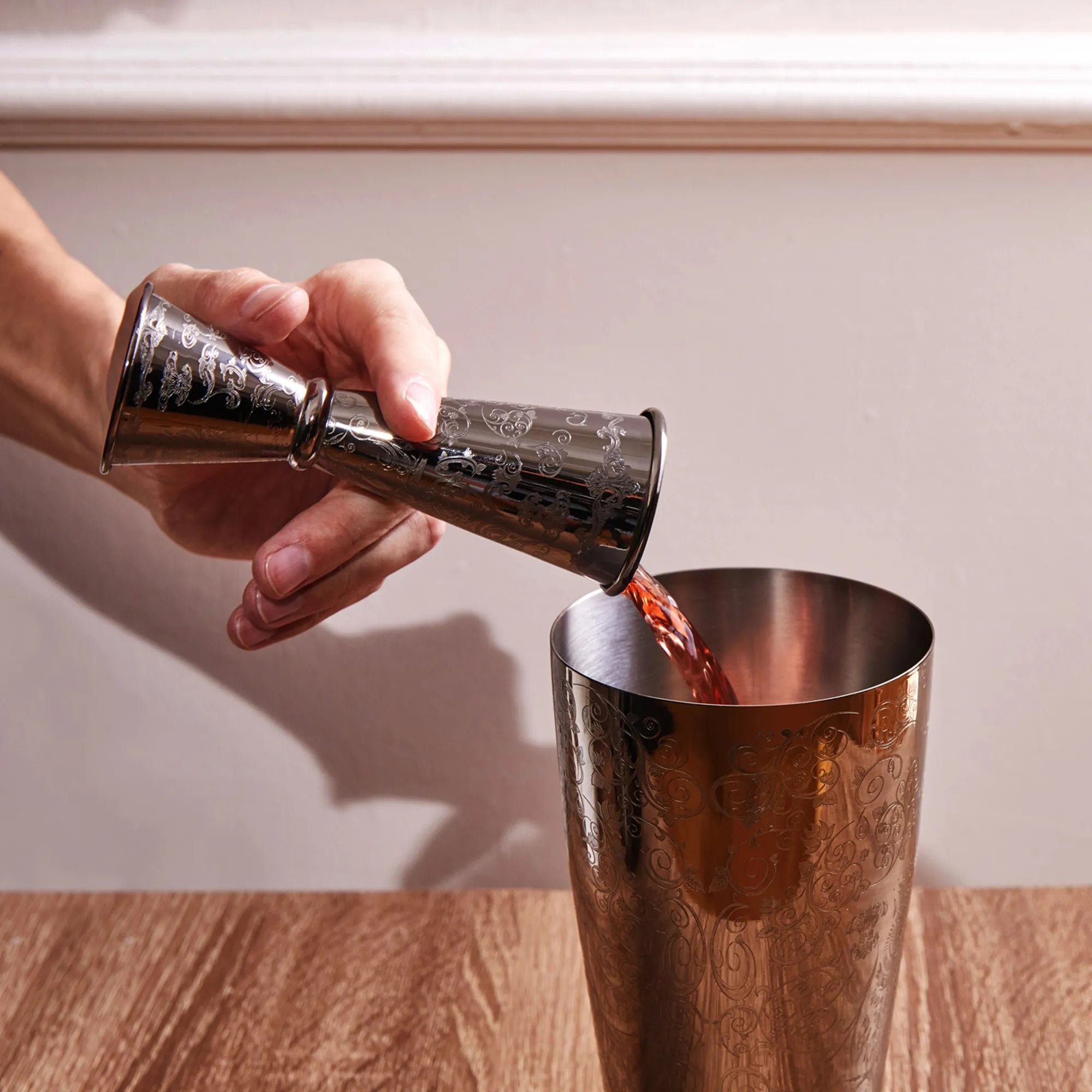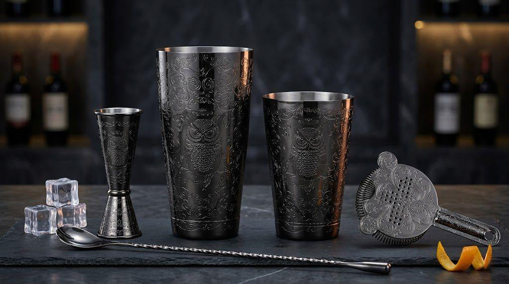 Upgrade your home bar with our professional-grade, stainless steel cocktail shaker set. Featuring a timeless engraved design, it’s the perfect blend of style and durability for every mixologist.